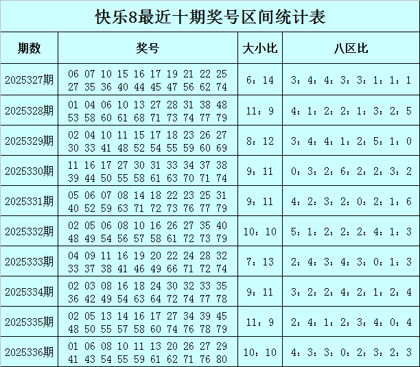 福彩快乐8第2025336期奖号为:01 06 08 10 11 13 20 26 27 29 41 43 54 55 59 61 62 71 76 80,其中奖号大小比为10:10,八区比为4:3:3:0:2:3:2:3。